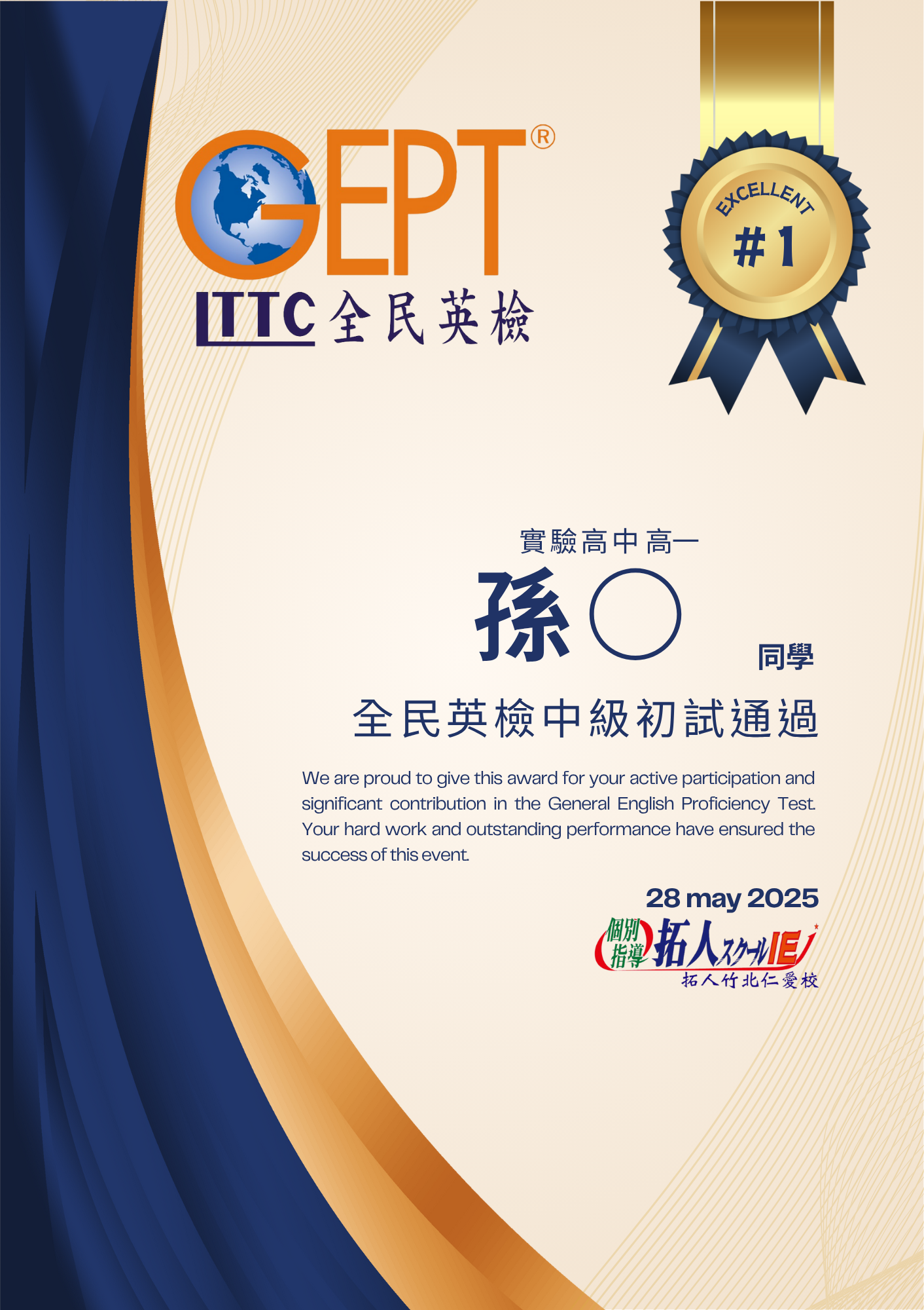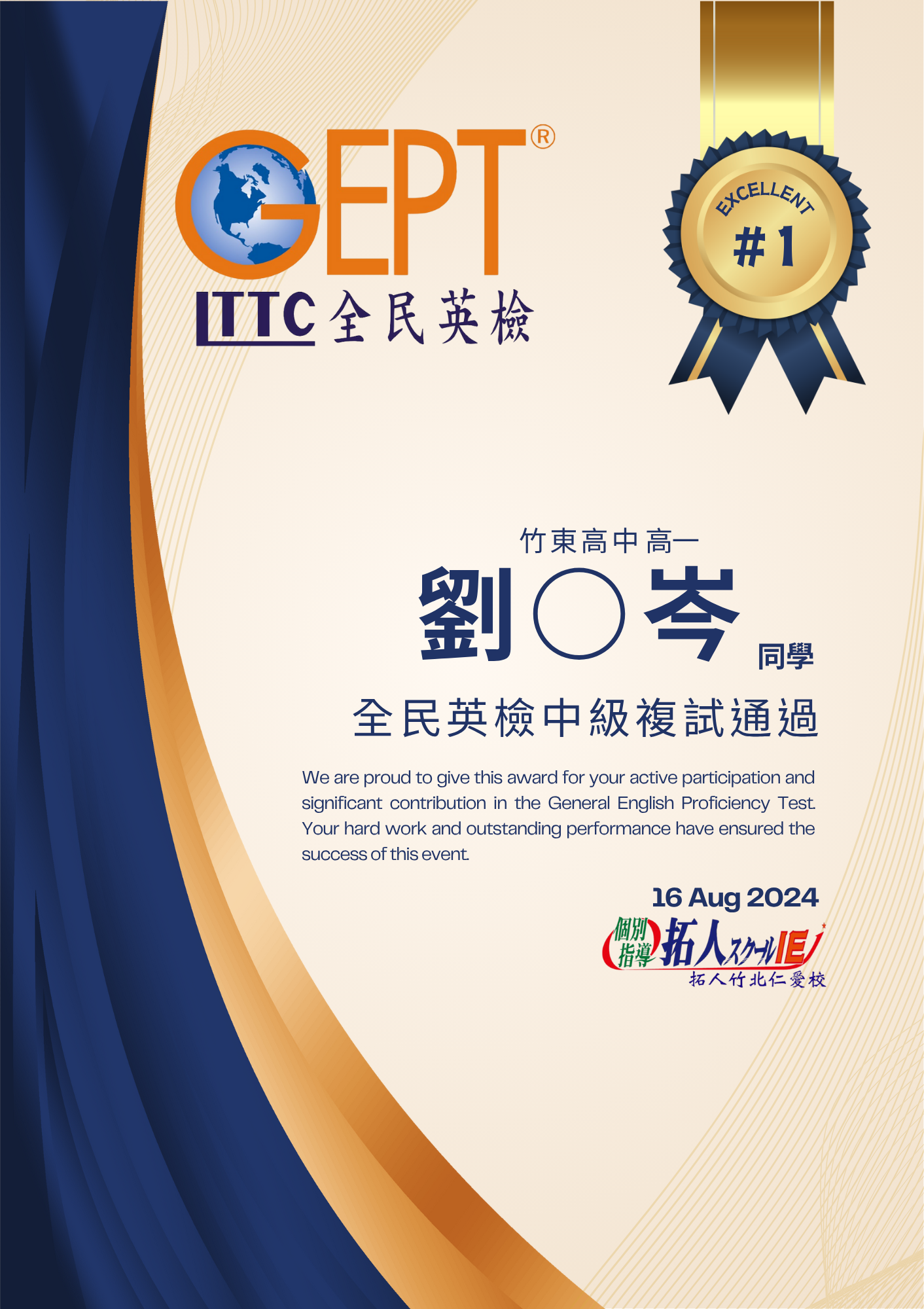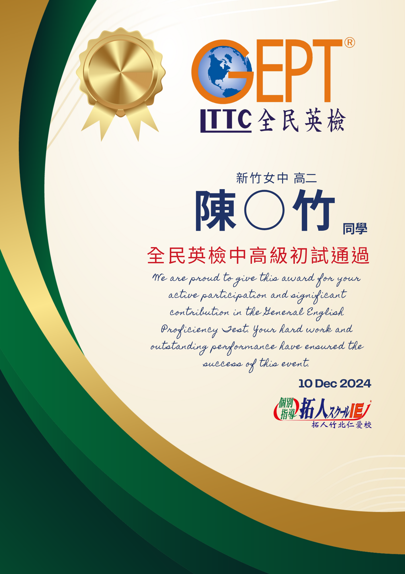 通過全民英檢中高級相當於新制多益785分以上的成績,亦或是托福成績達527分以上佳績,陳同學在學習英文的道路上可說是精益求精,好還要更好!