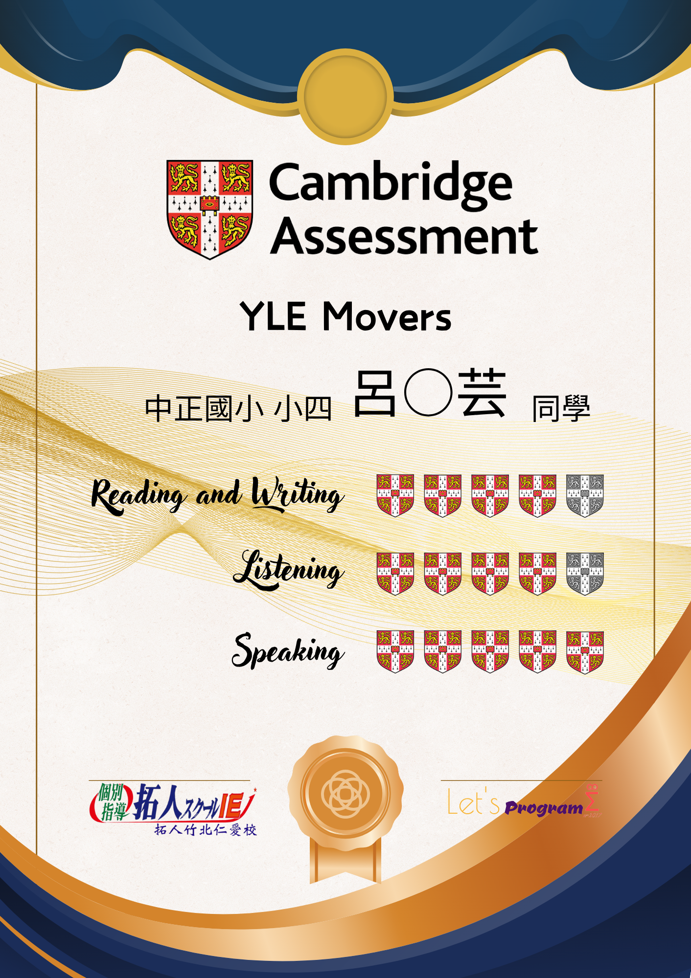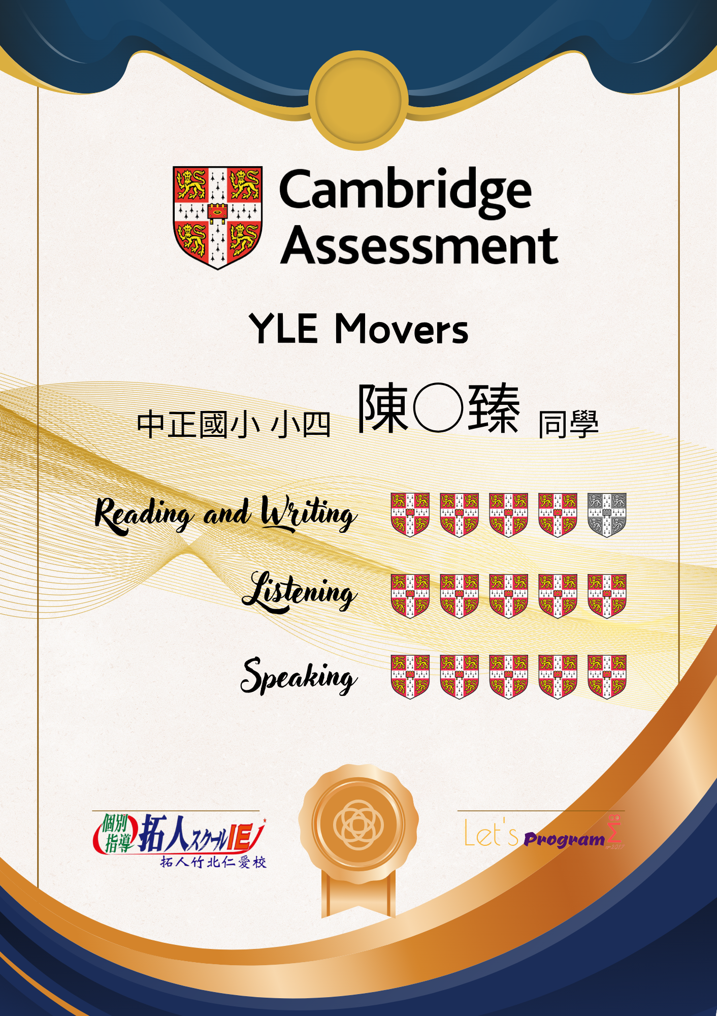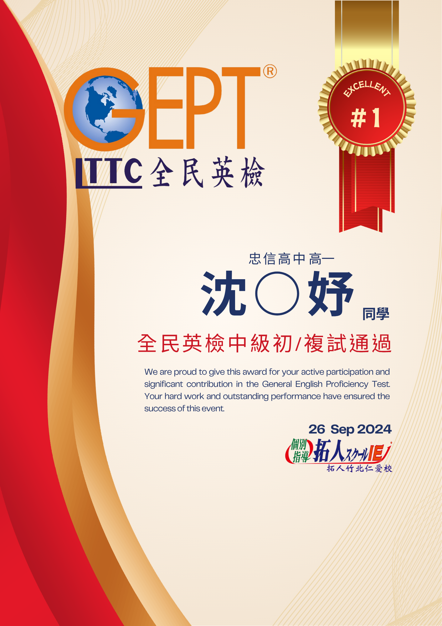 通過全民英檢中高級相當於新制多益785分以上的成績,亦或是托福成績達527分以上佳績,陳同學在學習英文的道路上可說是精益求精,好還要更好!