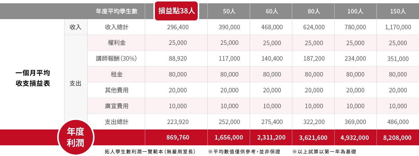 | 損益平衡速度 | 最快半年損益兩平 | 較慢,需自行摸索 | 一般約半年至一年 |